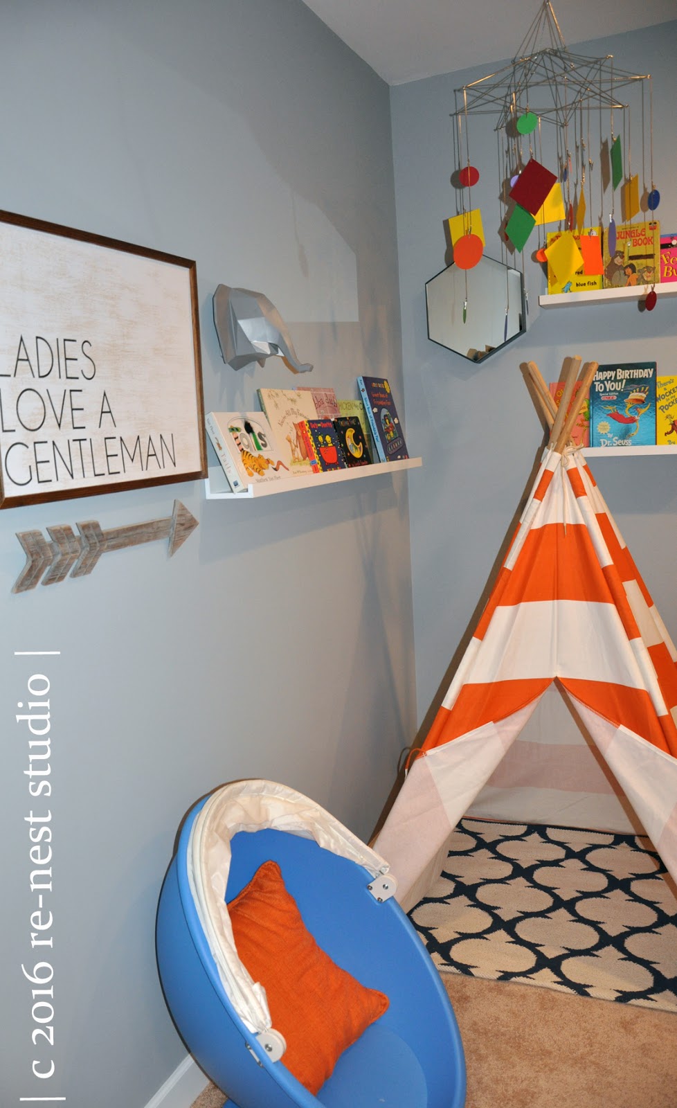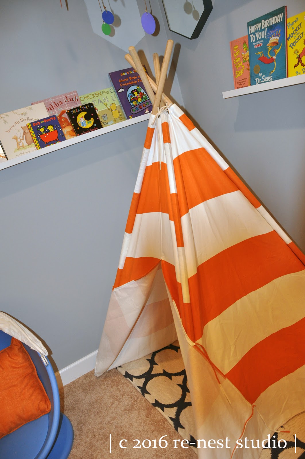 we already had the super cute orange-and-white striped teepee from land of nod + the navy-and-white rug from there too. but i wanted to create a space for the boys to read, relax + have fun, and selfishly, have somewhere to store the mountains of books!