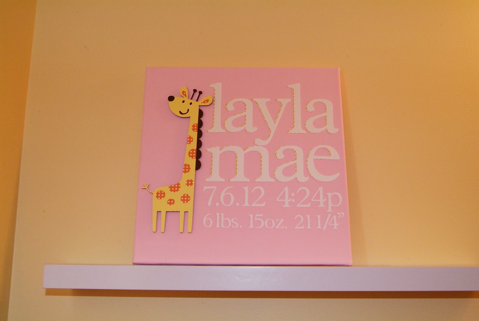 this very special little girl has a wonderful room, decorated with giraffes in pale yellow and green. to bring that special pink into the room, i went with a 12″ x 12″ canvas, covered in pale pink. we then, of course, had to include a special giraffe. and the most important part: the little lady’s birth info…all presented in varying sizes and layers (which of course gave that very special personalization for her room).
