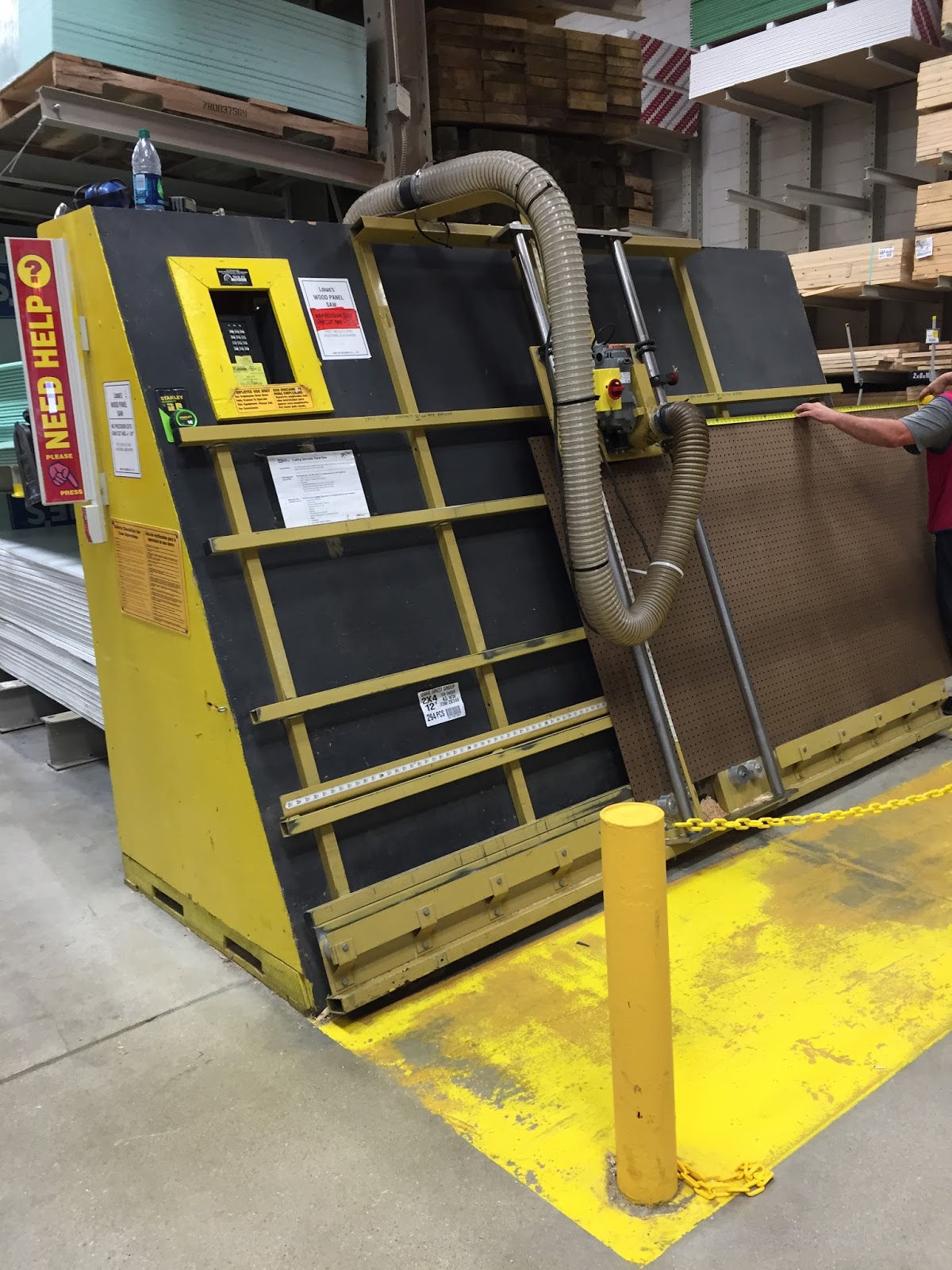 this might be the scariest looking thing ever. the large saw at lowes in dekalb. big props to the guys for helping get my pegboard cuts just right! |