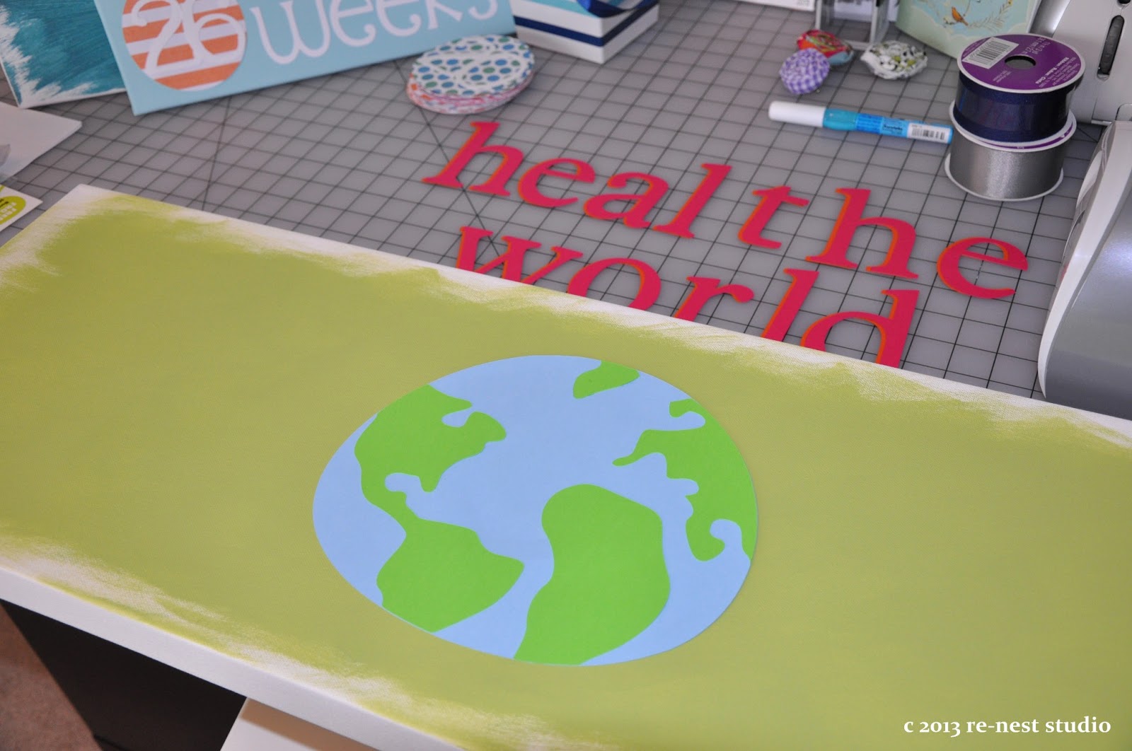 * next came testing out the cuts i needed with the cricut…i needed a large earth graphic and the headline “heal the world.” i ended up using a graphic from my give a hoot cartridge and also going with the font from plantin schoolbook. it took a couple of test tries with scrap paper, but i found my sizing for the earth and for my wording…up next was cutting on my actual paper and assembling.