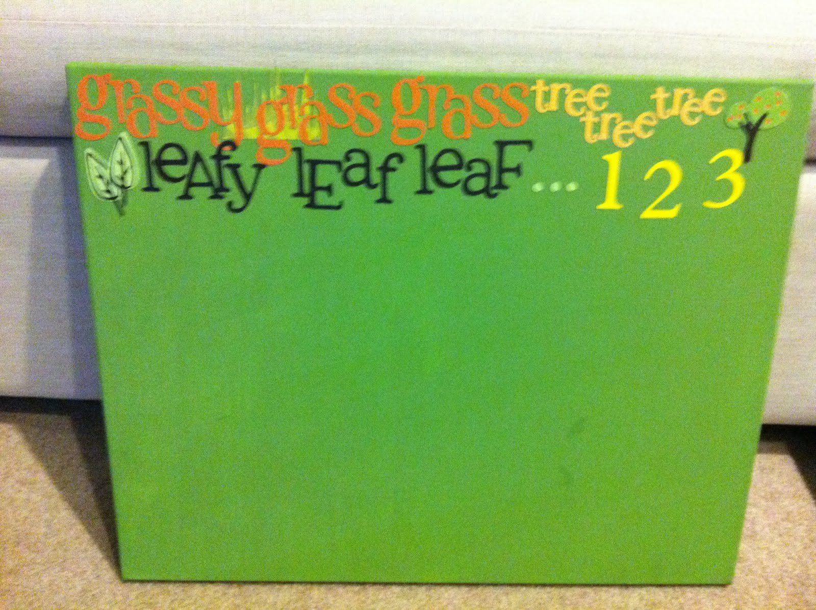 i started with a simple canvas and decided that based on the whole title of the poem the base color needed to be a grass green. two coats of green acrylic paint later, and we were ready to start.the first step was planning out placement of the poem – to do this, i simply tracked down a piece of paper that was the same size as the canvas and wrote out the poem to plan for spacing. this has been a huge help along the way…just so i didn’t get to the bottom of my canvas and only be halfway through the poem!