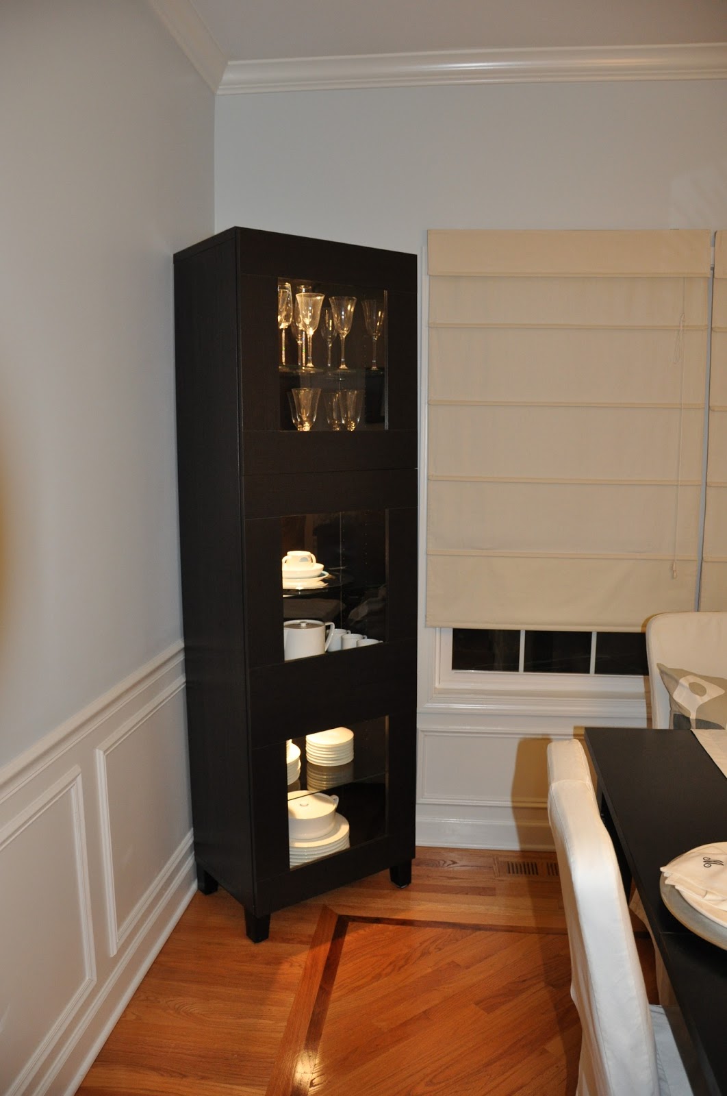 a display cabinet was needed. now, all of y’all know by now that mr. re-nest and i tend to be on the more modern side when it comes to furniture. we looked online and settled on a trip to ikea to see what we could find and make work. surprisingly, we found it. the ikea besta system. it had the ability to add some small lighting within the cabinet, along with glass shelving to let the light pass through (i had visions of the crystal glassware gleaming with the light and glass shelves….)