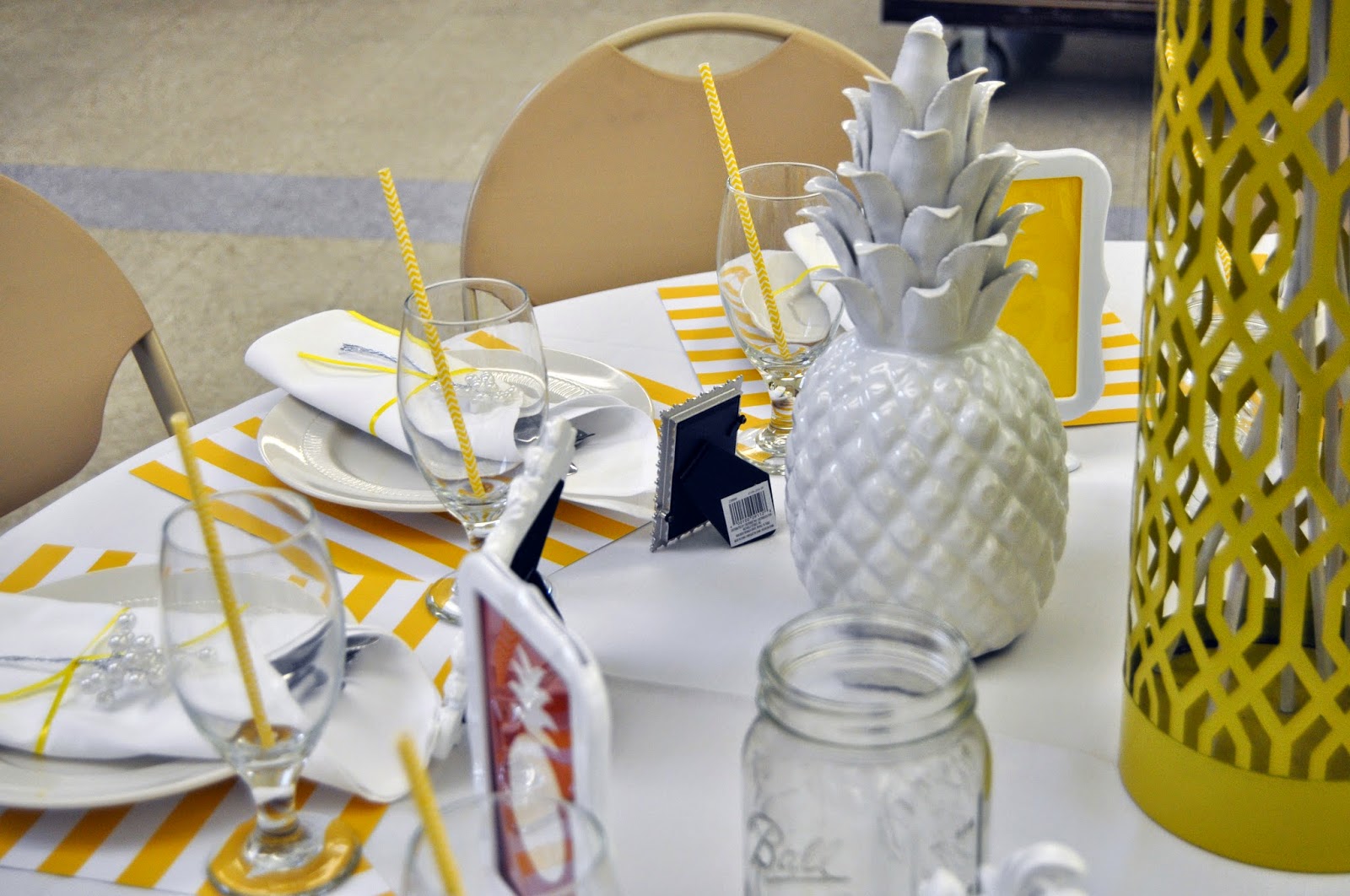 my re-nest table theme was a total extension of one of my latest obsessions: pineapples. more importantly, the symbolism of the pineapple in the home. (isn’t that cool? do you know about the symbolism of the pineapple? please, please check it out here! it’s really awesome!) for the table, i did a combo of “shopping” decor in the re-nest house + scouring hobby lobby, michaels and tj maxx for pineapple goods!
