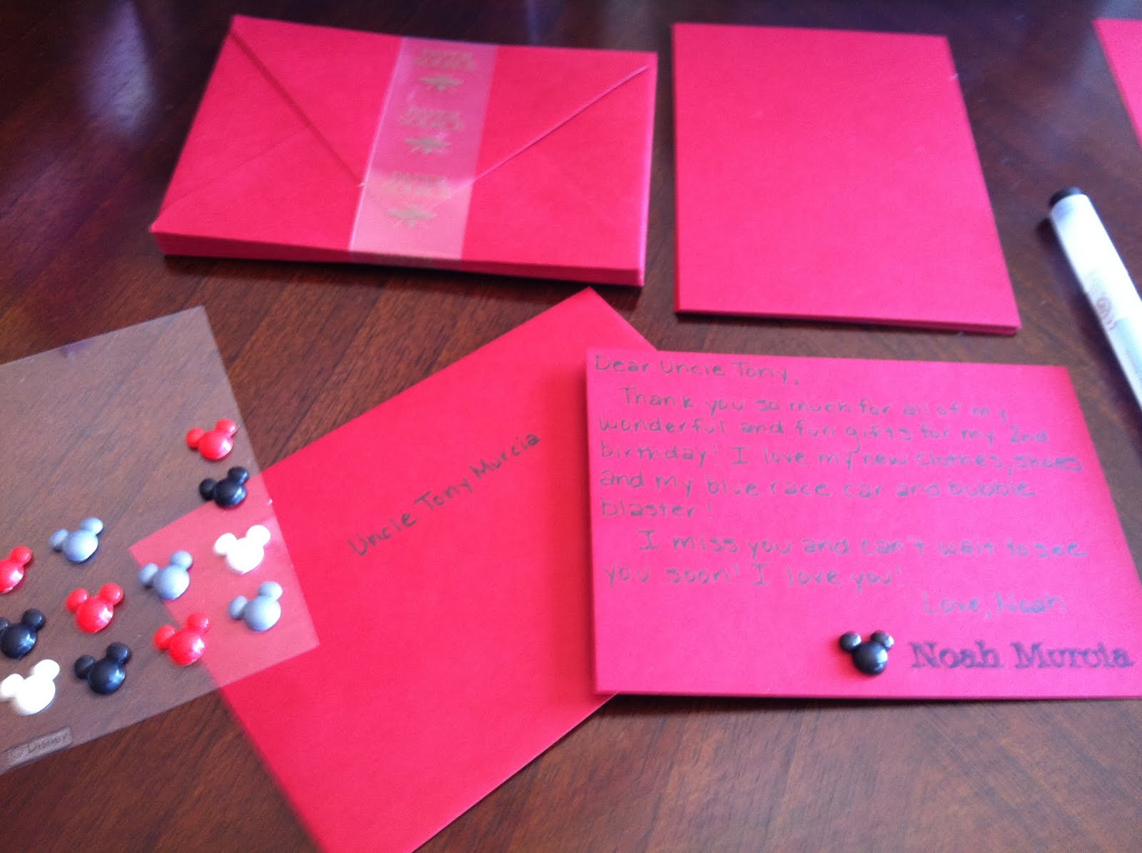 paper source was required.) sticking along with the mickey mouse theme, i got the small, simple 4 bar note cards with the 4 bar envelopes, all in paper source red. i adorned each with a mickey mouse sticky brad (very cool to have received from a friend) and then customized with noah’s personalized stamp (again, from my crafting guru and friend). they turned out really nice and were super-simple to make…and were a perfect thank you card to come from a two-year-old.