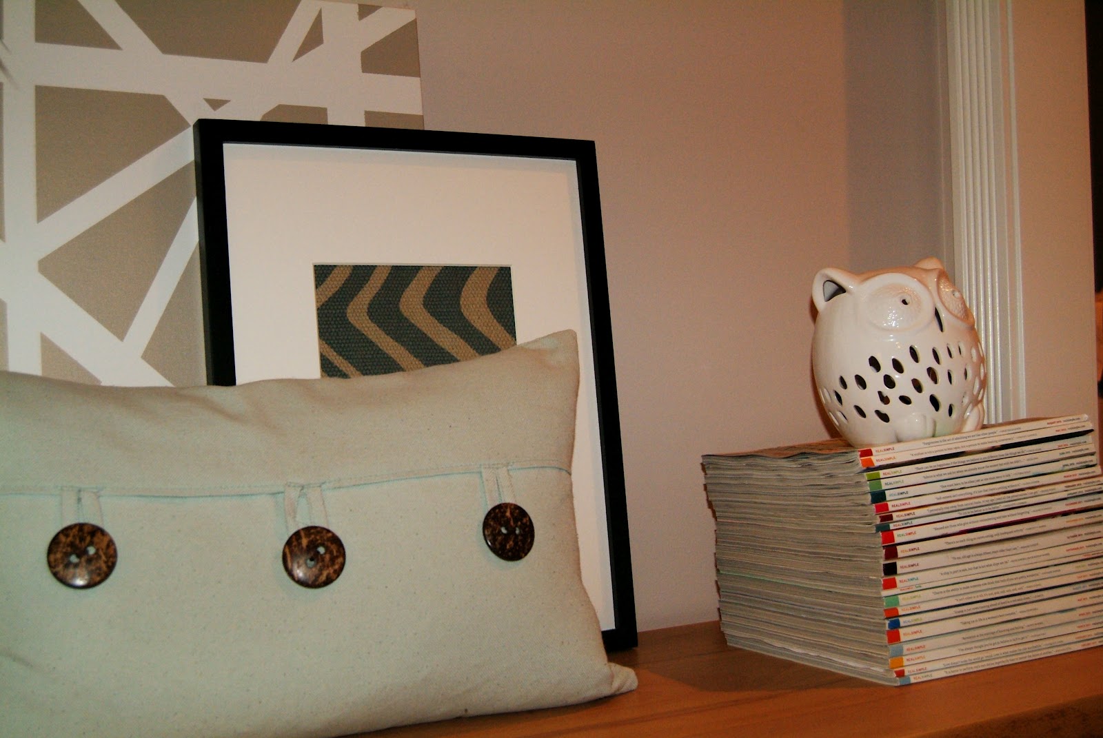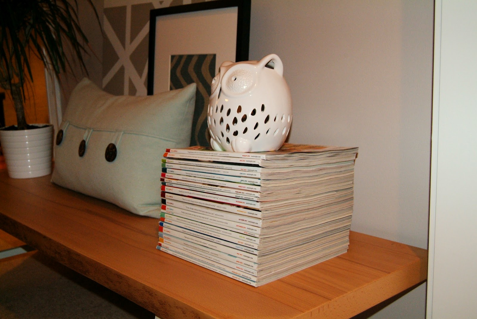 my stack of real simple issues. resting comfortably on our awesome ikea find, paired with artwork and a ceramic owl |