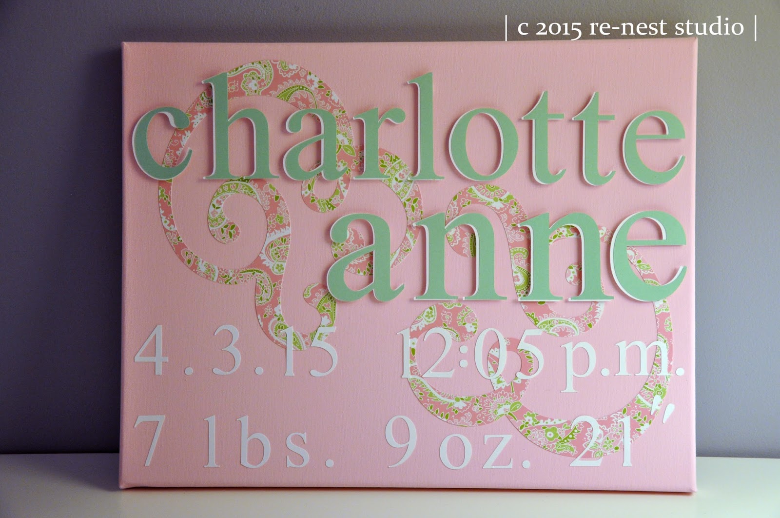 my first one i had the joy of creating was for a dear, dear friend of mine, who had an adorable little girl this spring! being a great friend, i was able to get a peek at this sweet girl’s bedding + nursery colors….and when i started sketching, i knew i have the most perfect patterned paper that had to be added to his piece! (note: if you know anyone who spends a lot of time in michaels or hobby lobby and is one of those people who hoards crafty supplies, that’s me. i find papers that are cool + cute, and i buy them….knowing someday i’ll use it. well, never make fun friends, because this was one of those projects where a piece of paper i’d had for probably two years was finally used!) and, isn’t her name just completely divine??