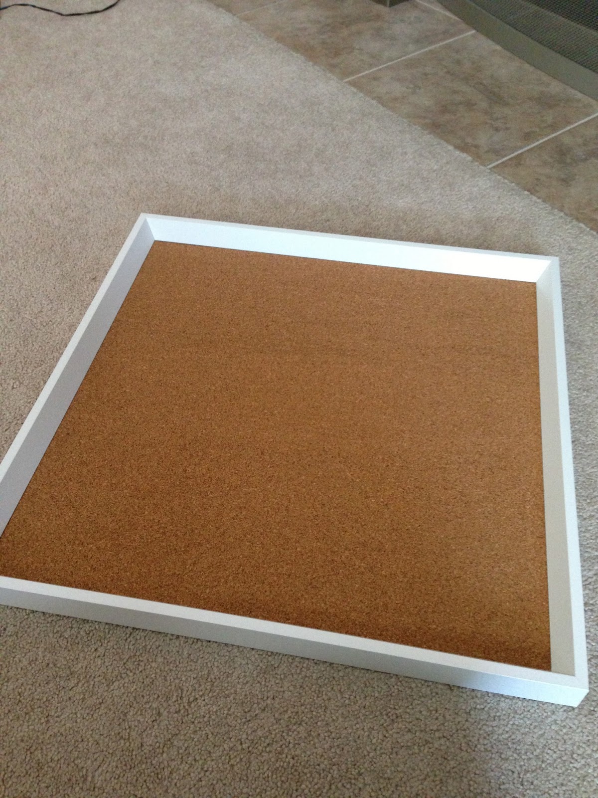 2. easy-peasy framed cork board. i wanted something a bit more than just a cork board i could buy at target or hobby lobby (you know what i’m talking about…the ones that are in the standard brown wooden frame). enter ikea again. i found a nice-sized, simple white wood frame, measuring 19-1/2″-by-19-1/2″…the norrlida frame. (note: the one on the website is larger than the one we got). this plus a roll of cork from hobby lobby, which i cut down to the size of the glass from the frame. (hint here: i actually cut the cork about 1/8″ shorter than the size of the glass to make sure that it wouldn’t “buckle” in the frame and end up wavy.